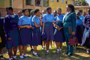 Head of Commercial Banking for Ecobank Malawi Limited Victoria Chanza with learners at Chichiri Secondary School